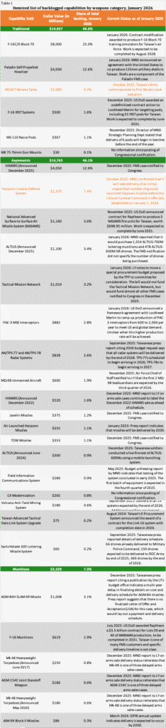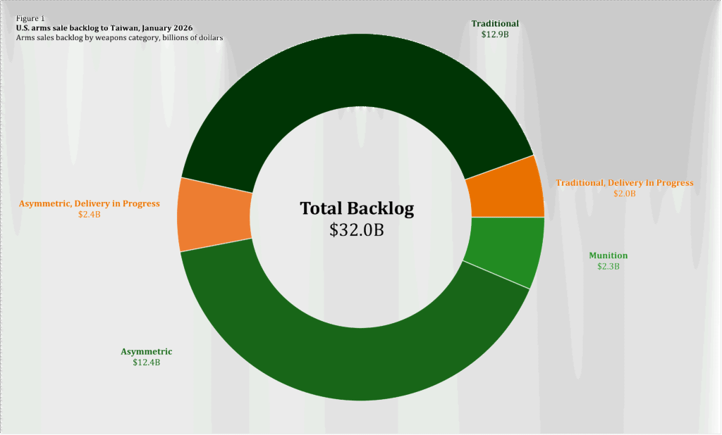 The arms sale backlog as of January 31, 2026, remains $32.0 billion. For arms sales valued at over $1 billion, deliveries in progress are marked in yellow-orange in our visualizations, meaning that the true dollar value is lower than the topline. Figure 1 illustrates the breakdown of the backlog between asymmetric weapons, traditional weapons, and munitions. Table 1 provides an itemized list of all arms sales in the backlog, including the most up-to-date information on their status.