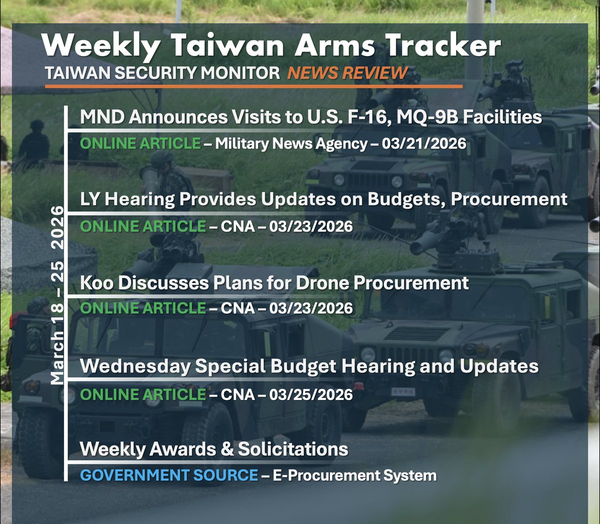 Taiwan Security Monitor (TSM) is a student-driven research initiative based at George Mason University’s Schar School of Policy and Government. TSM provides open-source analysis, data visualizations, and policy-relevant insights on Taiwan’s security environment and cross-Strait dynamics.