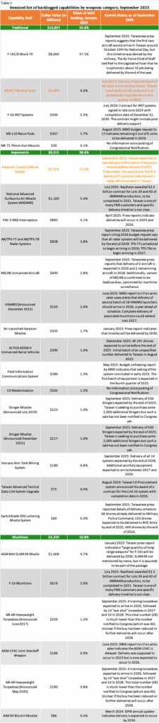 Although the dollar value of Taiwan’s arms sale backlog has not changed, 2025 has been a busy year for US-Taiwan arms sales. There is considerably more information available about delivery schedules and partial deliveries than last year, including much-faster-than-expected timelines for critical asymmetric capabilities like man-portable drones. We hope our methodological note explains our reasoning for not adjusting the backlog’s dollar value yet despite the partial delivery developments.