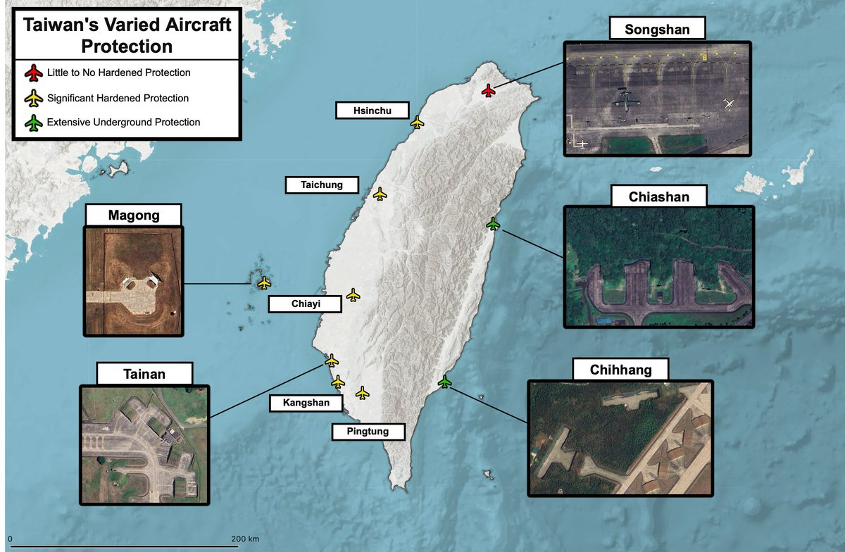 Our visualization shows the current level of hardened protection present at Taiwan’s major military airports.