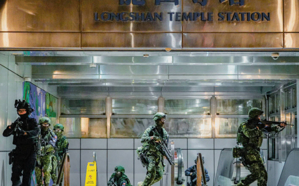 Units from the 211th, 229th, and 332nd Battalions operated under the Military Police’s 202nd Command. The 211th Battalion, or “Iron Guard Battalion,” is responsible for guarding the Presidential Office and other key heads of state in downtown Taipei. Images show military personnel conducting CQB and seizing key positions as they exit Taiwan’s subway system. Other scenarios also included simulated artillery, gas, and drone attacks, forcing troops to shift constantly between underground and surface operations.
